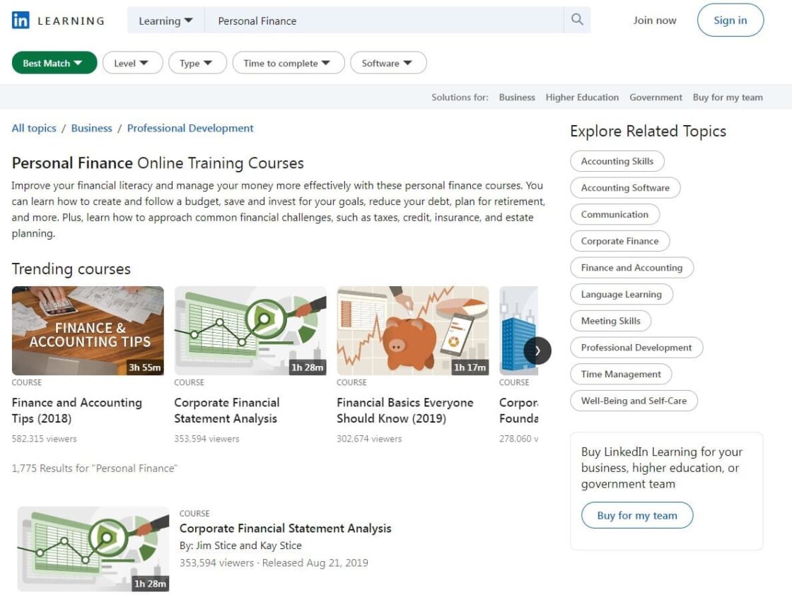 LinkedIn Learning needs a subscription, which your company might pay for. It’s a strong pick if you want to tie your job growth and your financial growth together.